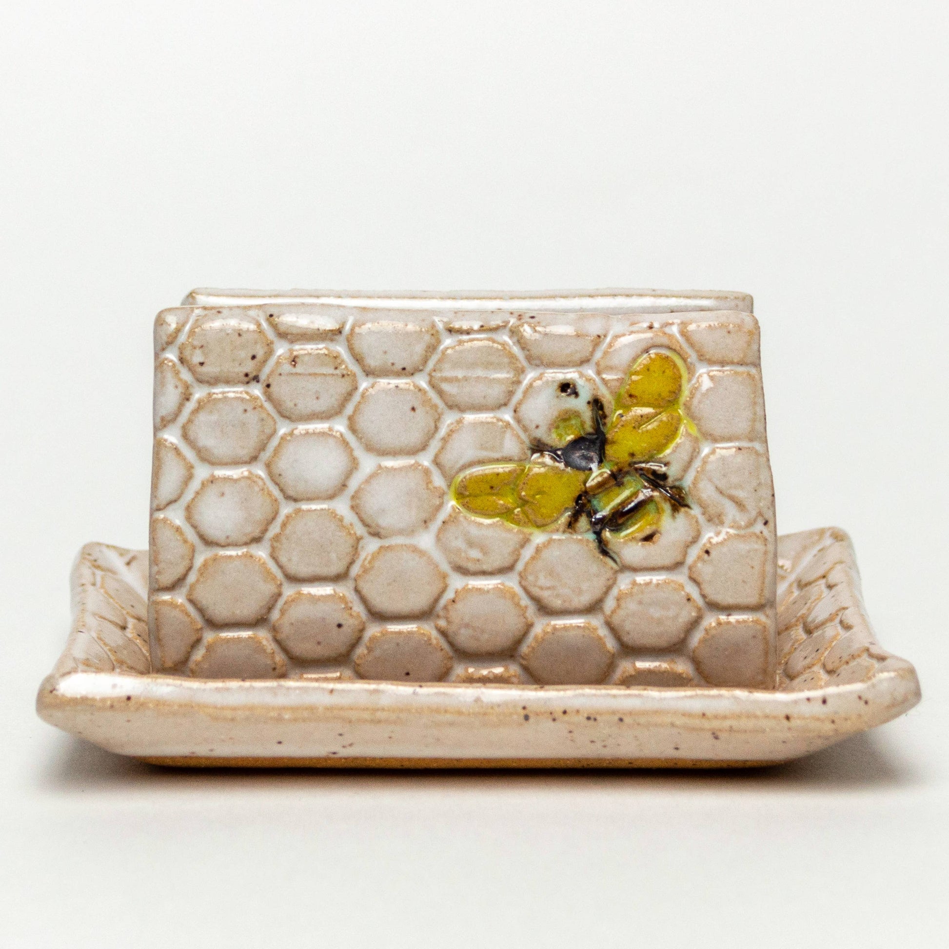 This beautiful stoneware ceramic bee pattern sponge holder is hand-built and hand-glazed. Food, dishwasher, and microwave safe. It measures approximately 4 inches long by 3 inches wide and 2.5 Inches high. All ceramic items are handmade and will vary from one to the next. No 2 pieces will be exactly the same. Colors may vary slightly.