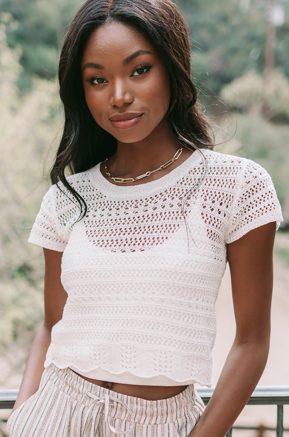 Is there anything more beautiful than a crochet top in the summer? Add the Callie Crochet Top to your cart. With a T shirt style, you can layer this on top of a simple white tank or a bathing suit top. Model is 5'9" and is wearing a size XSmall