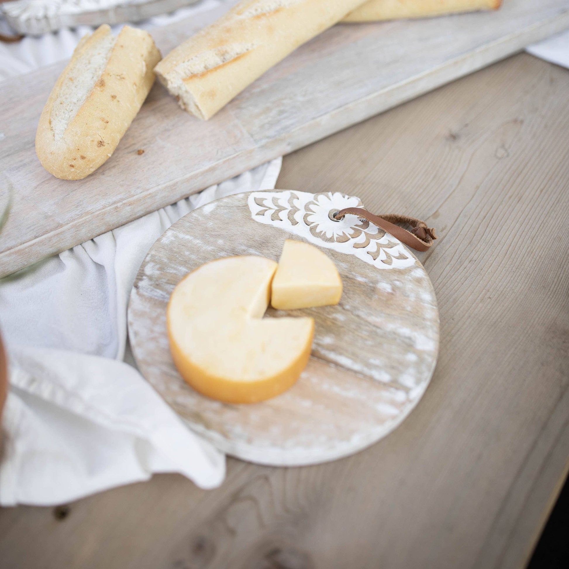 this small round board is perfect for all your preparing and serving needs. The natural mango wood grain allows this cutting board to sit seamlessly with your other kitchen accessories. The quality craftsmanship that is hand carved into the whimsical floral design across the top and washed in white will make you want to keep these out as a traditional kitchen accent when not in use. -This food safe serving and cutting board functions as a stylish entertaining piece or simply to add a decorative element to your kitchen -The mango wood used is part of a sustainability effort in India. For each tree harvested, at least one is planted in its place -Hand wash with warm, soapy water and set out to air dry completely after initially drying with clean cloth -Dimensions: 8 x 8 x 0.75"H