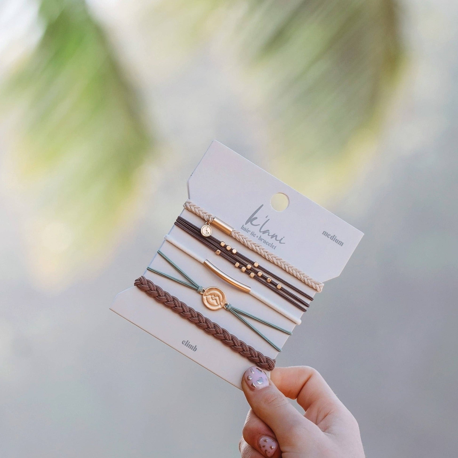 CLIMB. Your mountain top is in reach. K'lani hair tie bracelets can be used as a bracelet or hair band. Medium is the size of a normal hair tie band.