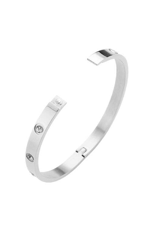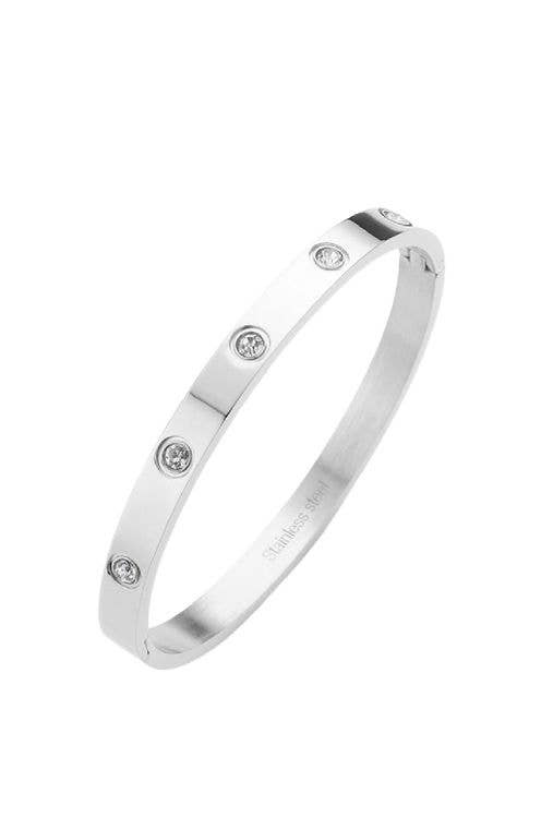 Beautiful crystal stone bracelet with hinged closure. Stainless steel. 0.25" H, 2.25" D. Lead and nickel compliant.