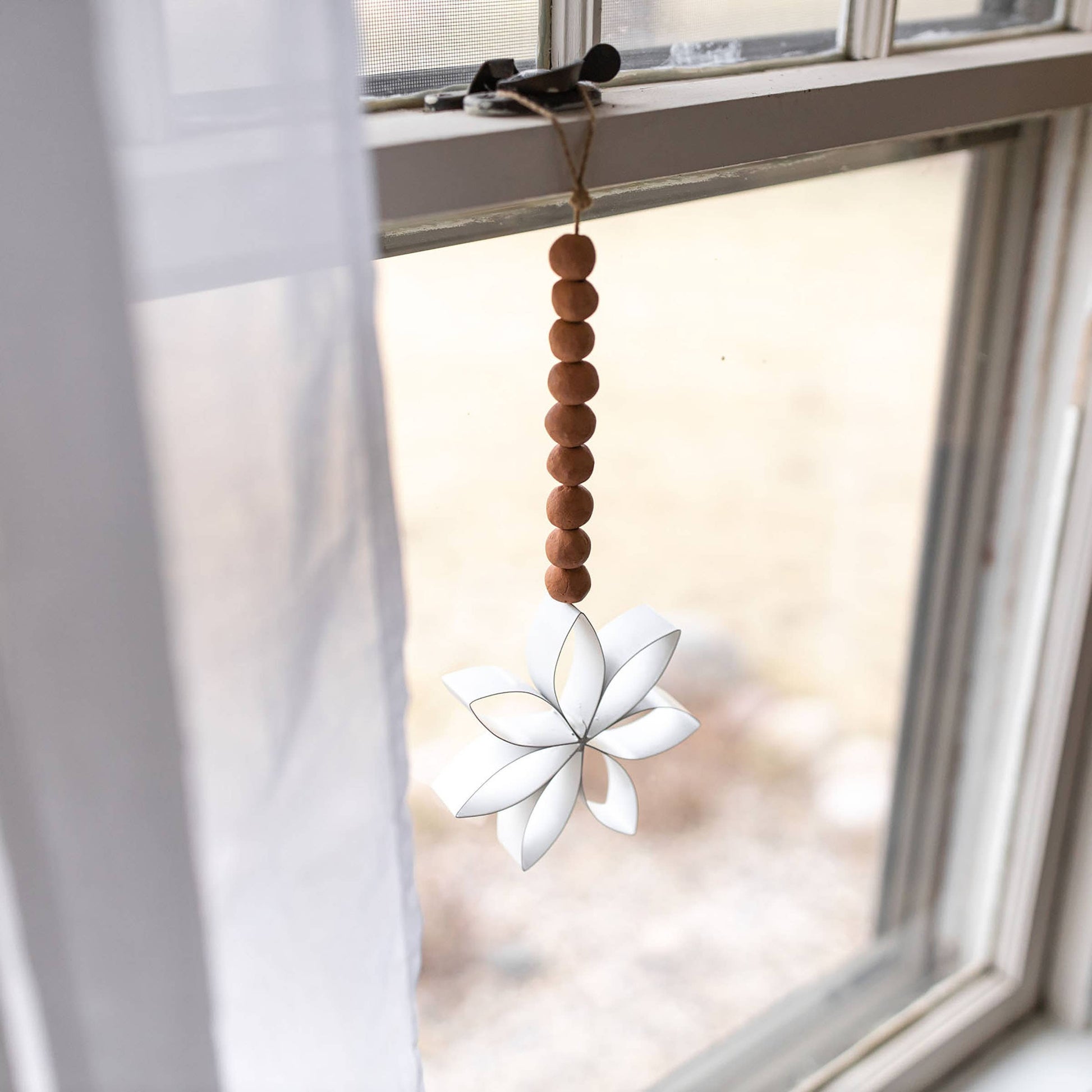 This daisy floral hanging accent is a great traditional decor piece to add a fun vibe to any space. Get creative by adding this decor accent to walls, doors, baskets, or other spaces. The hand-formed natural terracotta clay beads are strung together by hand on jute cord to create a garland, and delicately finished with a white metal daisy icon at the base. -Hang from your favorite basket or add to a stack of books for textural detail. -Crafted from terracotta that is hand formed by artisans in India. Due to the handcrafted nature of this item, no two pieces will be identical. -Jute is one of the most environmentally friendly plant-derived materials because its fibers can be recycled more than once. -Dimensions: 4 x 0.75 x 11.5"H -Material: Terracotta, Metal & Jute -Hand formed natural terracotta clay beads accented with clean, white metal.