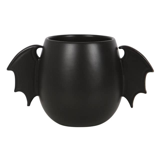 Customers will go batty for this unique mug design! A pair of bat wings replaces a traditional mug handle and a sleek, black finish makes it a great choice for personalisation. 300ml capacity. Hand wash only. Do not microwave.