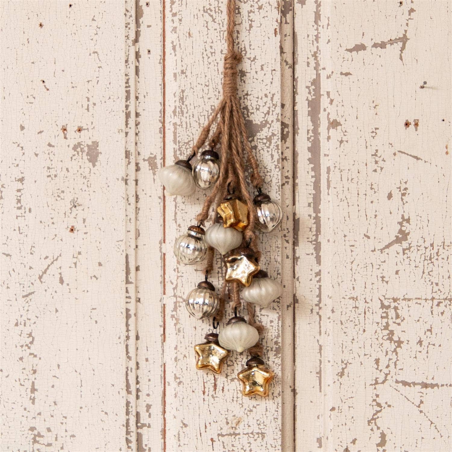 Audrey's Home & Gift presents the Hanging Cluster Asstd Colors Mercury Glass Ornaments. Made from glass, jute, and iron, these ornaments are a testament to Audrey's passion for crafting handmade products. Each ornament measures 16" L x 1" Dia, making them a noticeable addition to any decor. The varied colors of the mercury glass will reflect beautifully off your lights, adding a magical glow to your home.