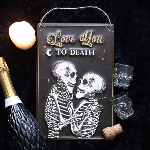 This hanging metal sign is perfect for showing your undying affection. Featuring a romantic skeleton couple in an eternal embrace and 'Love You To Death' text, this sign makes a great gift to commemorate love and togetherness.