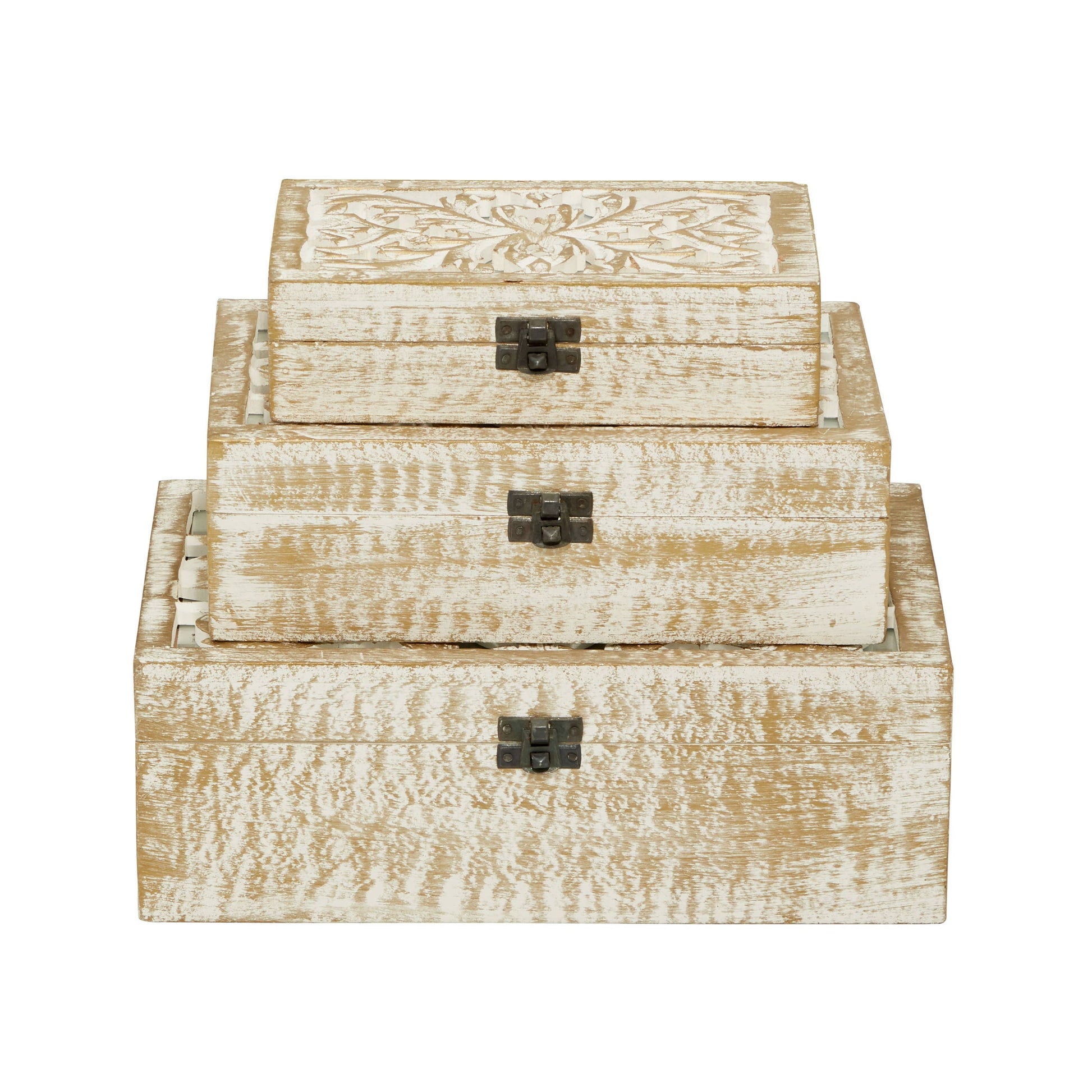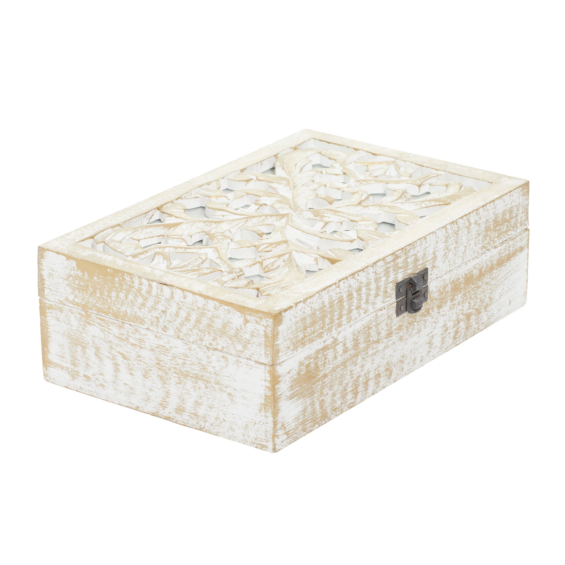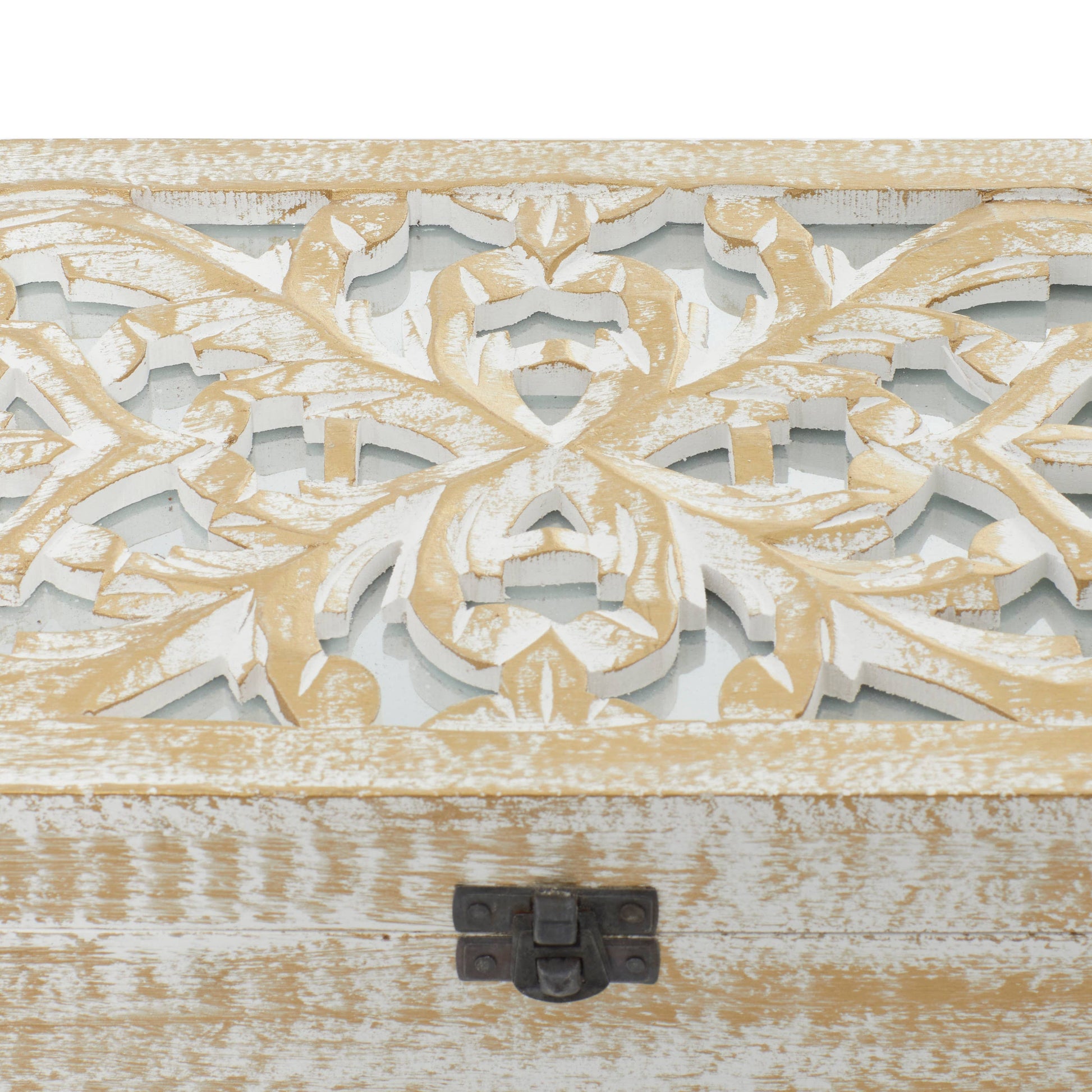 Perfect way to add depth and texture to your surface space with this compact and discreet box. A practical yet stylish upgrade that instantly elevate the look of your room. This floral set of 2 decorative keepsake boxes can be used together or separately to store personal belongings in the bedroom or to enhance table displays in the living room. Designed with felt or rubber stoppers at the base that prevent scratching furniture and table tops, as well as sliding around. Mango wood box makes a great gift for any occasion. Due to the handmade nature of this item, no two will be alike, there will be slight differences in shape, size, and color. Suitable for indoor use only. This item ships fully assembled in one piece.