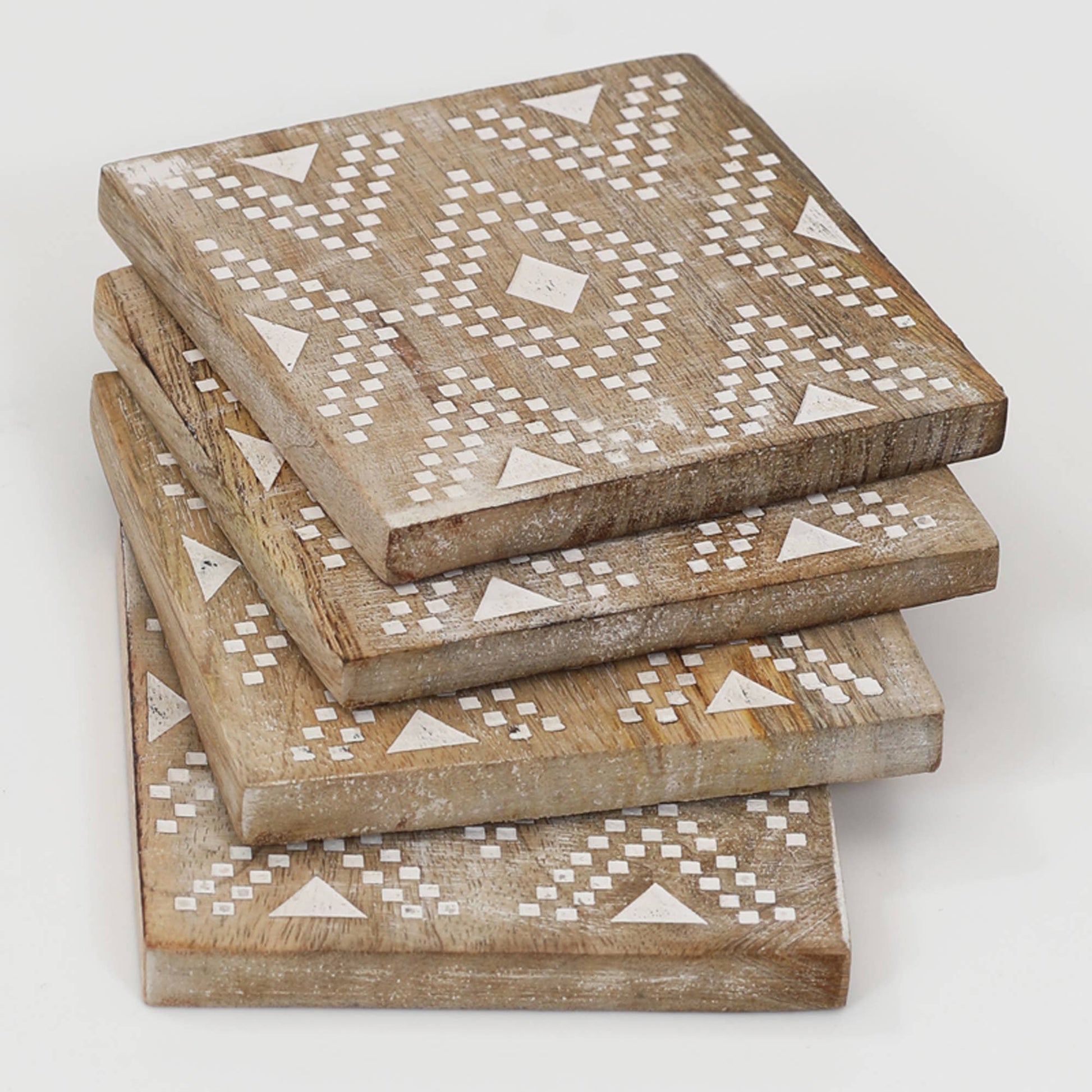 Worry too much about the stubborn water rings or hot coffee cup stains on your table? We have brought for you three eco-friendly sets of coasters that are crafted from anti-bacterial mango wood and given a distressed white finish to enhance your tablescape. One set features a floral design with a wood-carved finish, while another comes with an abstract pattern to enhance your dining room décor.