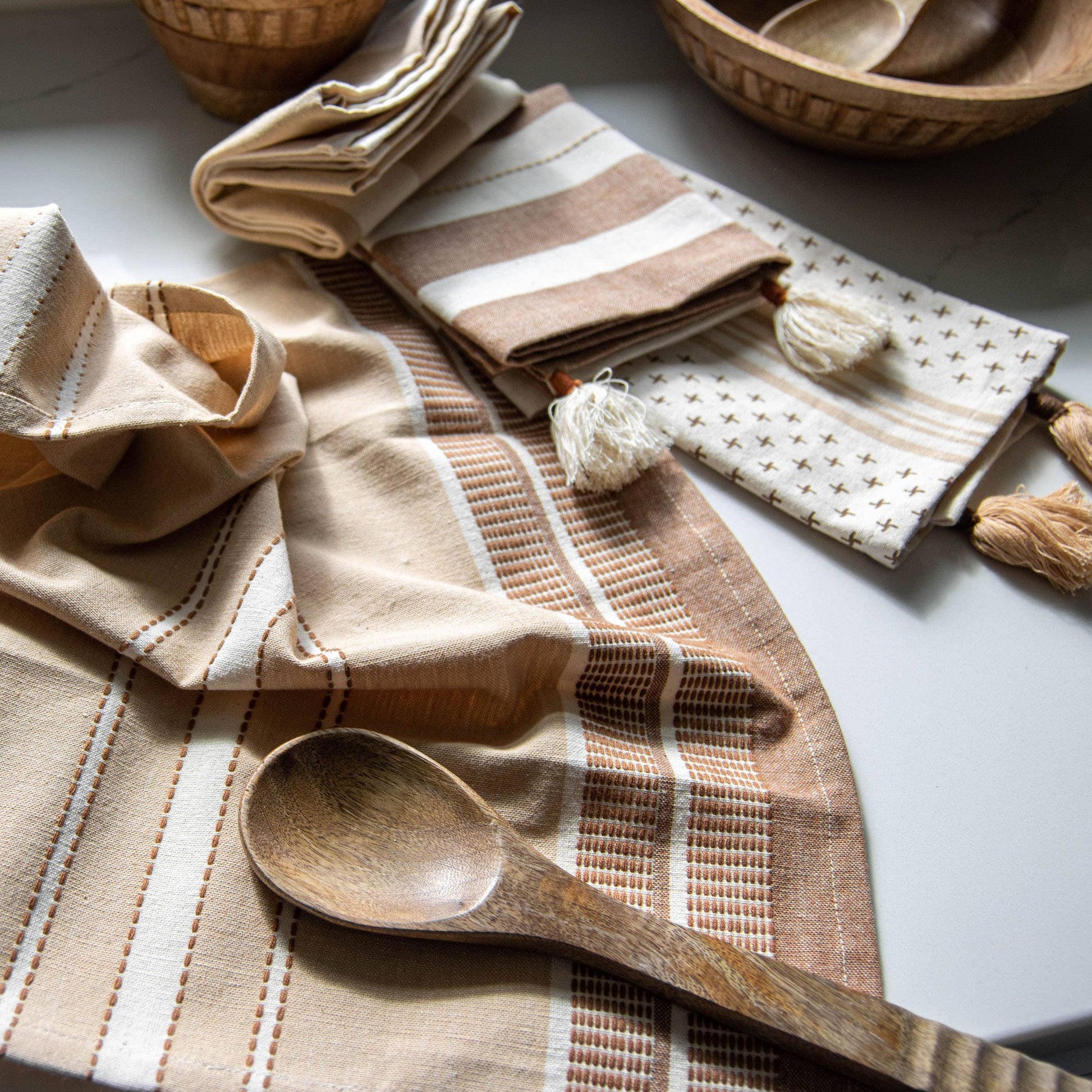 Accent the kitchen with this timeless set of four tea towels exclusively from Foreside Home & Garden. Classic ticking stripes accent a cross stitch pattern in multiple shades of brown. Additionally, two towels are finished with textured hand sewn tassels and stitched details.