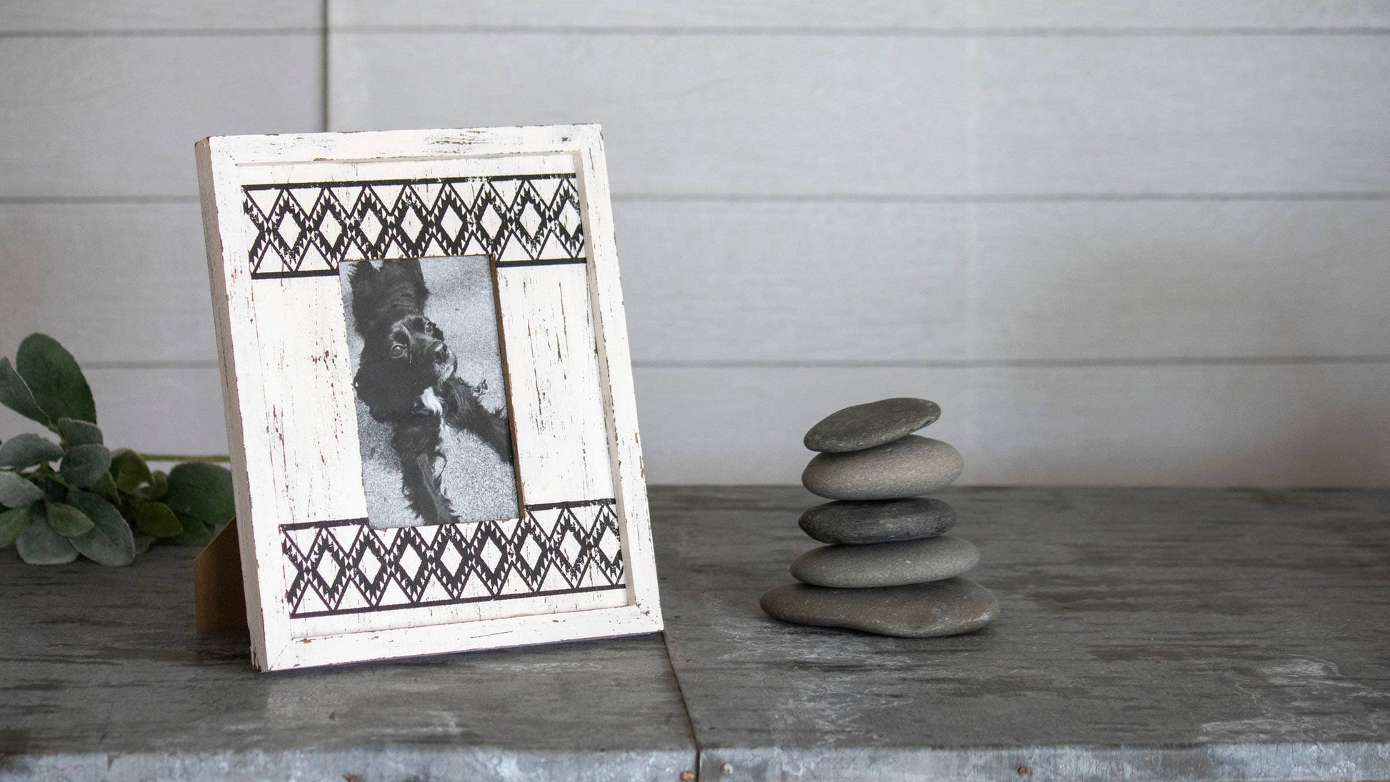 4x6 wood photo frame exclusively from Foreside Home & Garden. A rustic white painted frame inset into a raised white border, and finished with a black diamond design. The contrast of black and white give this a classic feel while also infusing an eye-catching decorative accent to display your favorite photo memories. The glass front will help to protect your photo from dust and other damage. A beautiful frame for your shelf, desk, side table, mantel, or hung on a wall for a versatile display anywhere in your home. -Glass front included to protect photo. -Holds up to a 4x6 size photo. Easy tab back allows convenient access to change out photo. -This frame has an easel back and 2 sawtooth hangers on the back allowing for portrait or landscape orientation whether hanging or on a tabletop surface. -Dimensions: 9 x 1 x 10.75"H