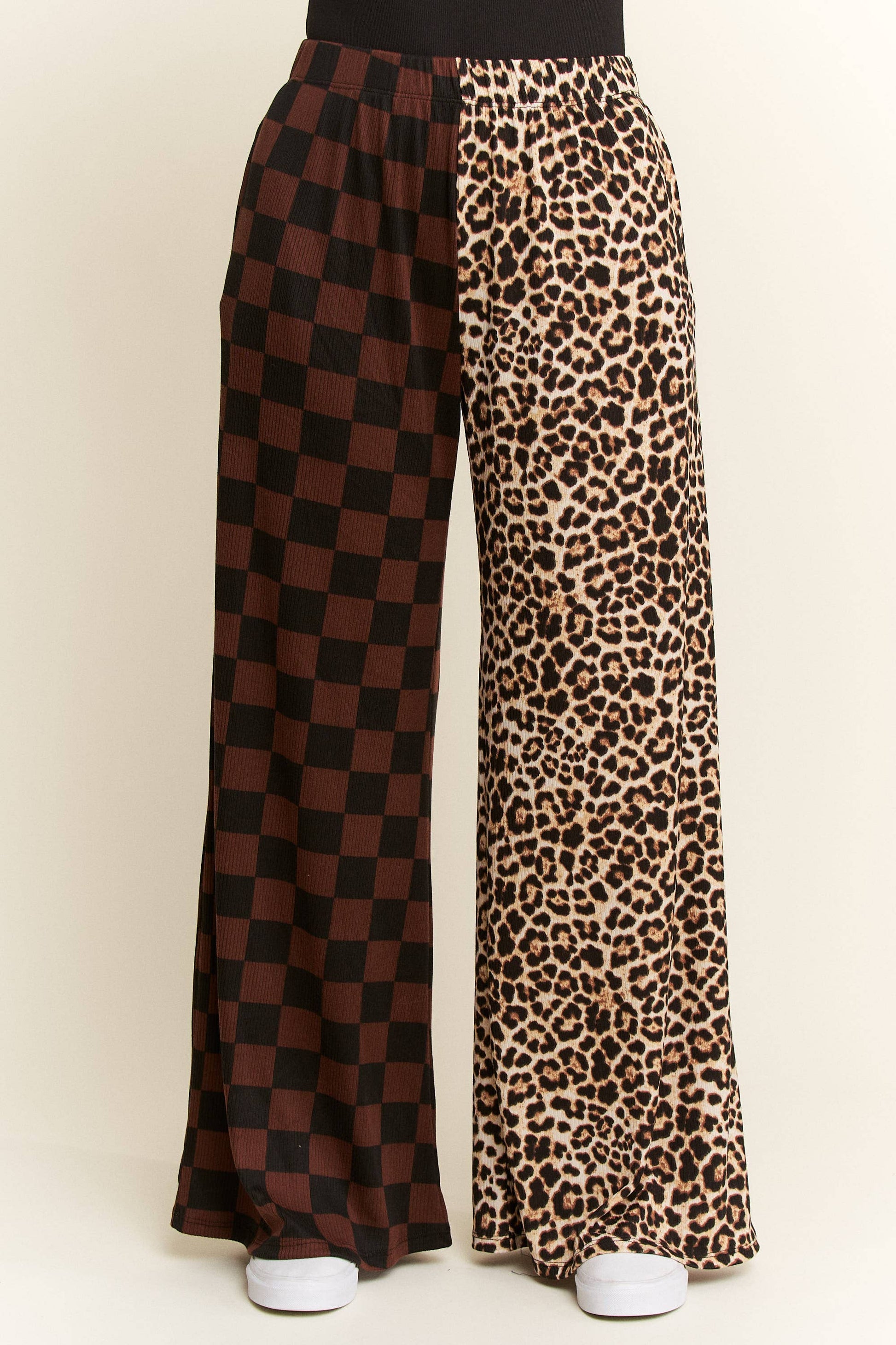 SPLIT DECISION LEOPARD-CHECKERED PANTS - Ribbed material - Soft, stretchy - Elastic waistband - Pockets - Slightly flared bottom - Full length