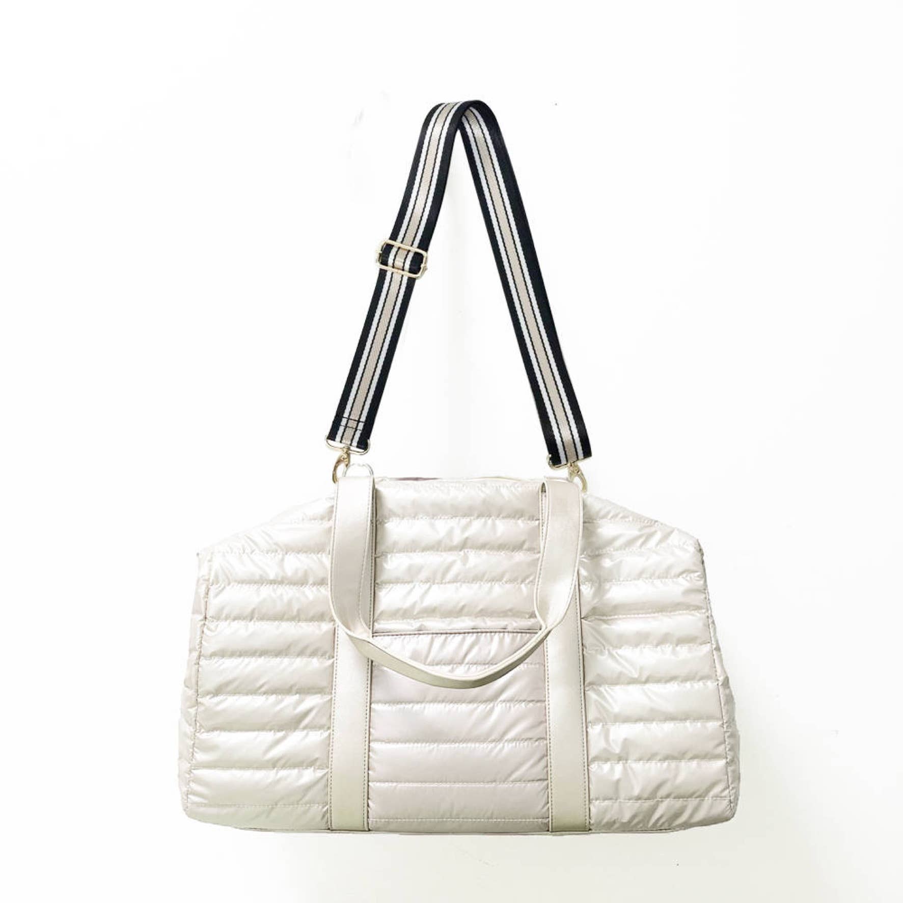 Our Newest Cassie Weekender is perfect for all your overnight adventures. This Nylon Puffer weekender has interior pouch and pockets for your essentials.Removable hard base. Adjustable strap and top handles make this convenient and comfortable.Care: Hand wash or delicate cycle in cold water with gentle soap.Do not bleach. Hang to dry.Dimensions: 26in L x 10in W x 15.5in H