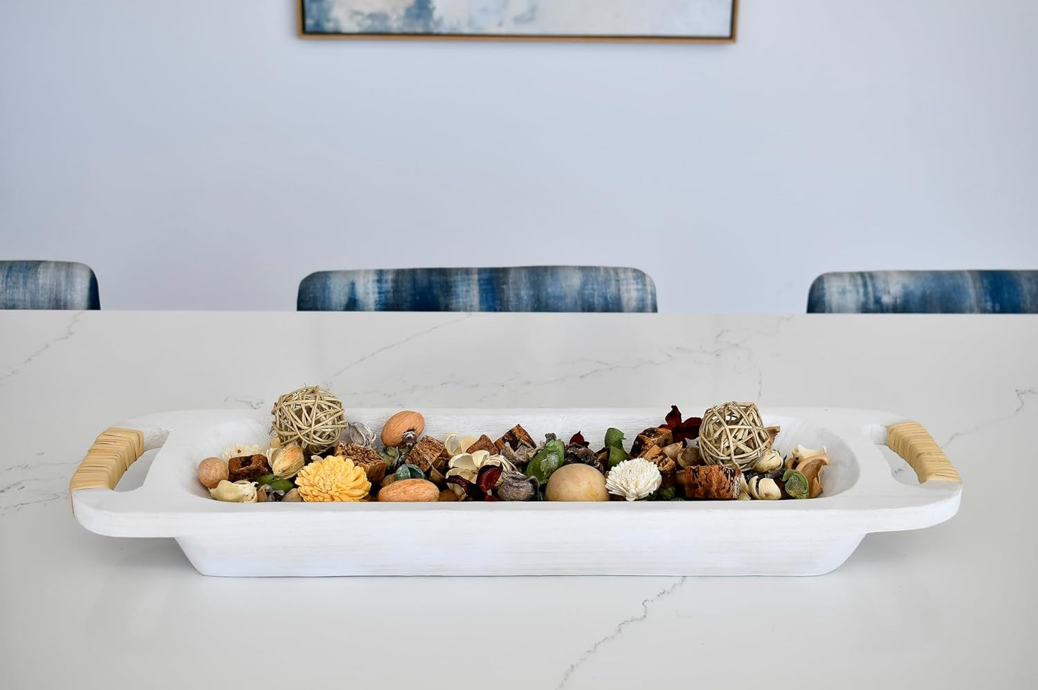Expertly crafted from lightweight and durable Paulownia wood, the 25.3” x 7” x 2.5” dough bowl with natural rattan-wrapped handles boasts a distinct wood grain pattern.